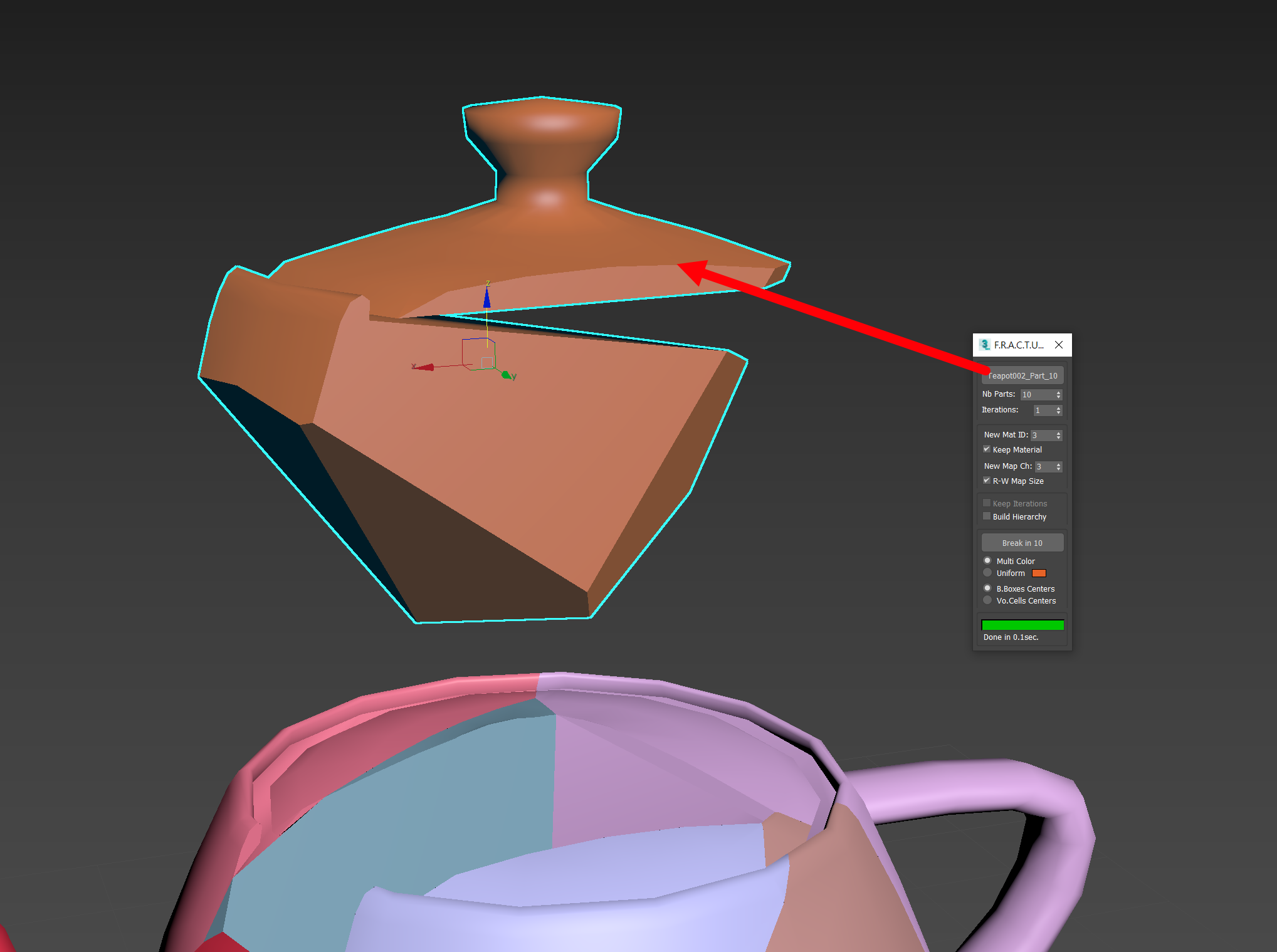 7)더 작은 조각으로 만들기위해 조각난 오브젝트의 일부를 선택하고 break in를 한번더 실행합니다.