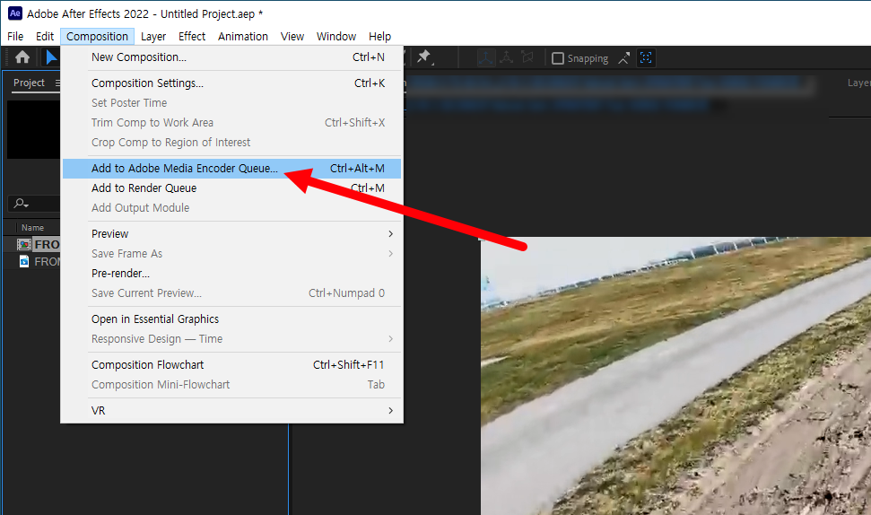 2)에프터이펙트에서 add to adobe media encoder queue를 선택합니다.