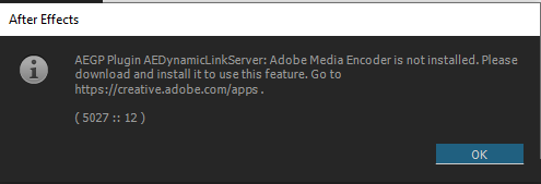 AEGP Plugin AEDynamicLinkServer: Adobe Media Encoder is not installed. Please download and install it to use this feature. Go to https://creative.adobe.apps. (5027:: 12)
