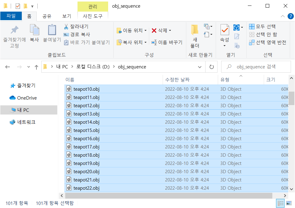 3)프로젝트에 OBJ sequence를 가져오기한것을 확인할수있습니다.