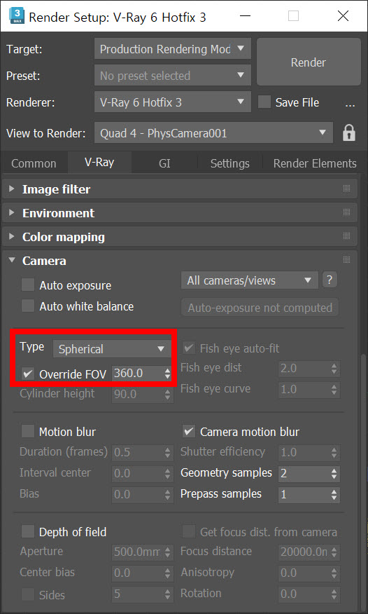 5)vray 탭의 camera에서 sperical 타입을 선택하고 override FOV에 체크한후 360를 입력합니다.