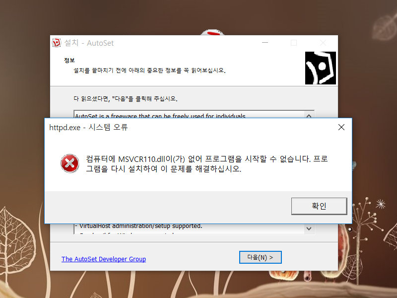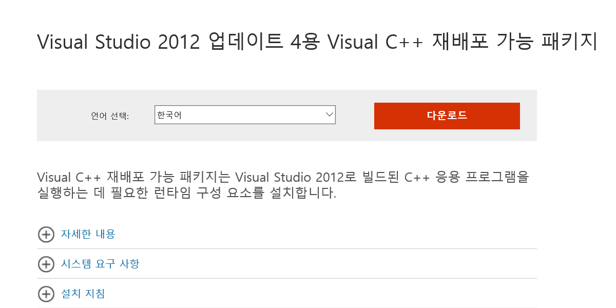4)비쥬얼스튜디오 런타임 구성요소(Visual C++ Redistributable)를 설치하지않으면 다음과 같은 오류 메시지를 표시한다.