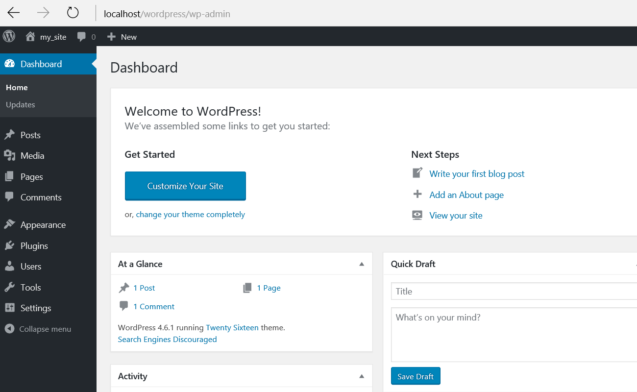 9)웹브라우저에서 http://localhost/wordpress 주소로 계정 로그인을 진행합니다.