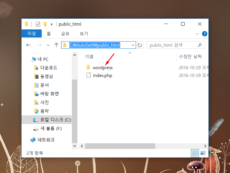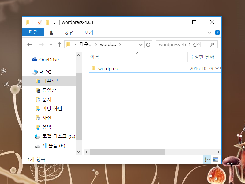 3)압축풀기한 wordpress폴더(wordpress-4.6.1) 안에있는 wordpress 폴더를 아래 경로에 위치시킵니다.