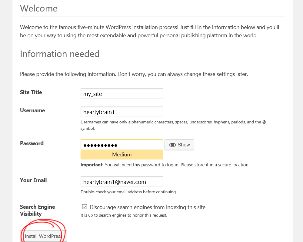 7)워드프레스의 기본정보를 입력합니다. 웹사이트의 제목, 로그인 계정, 암호를 설정합니다(이 기본정보는 나중에 변경가능합니다)