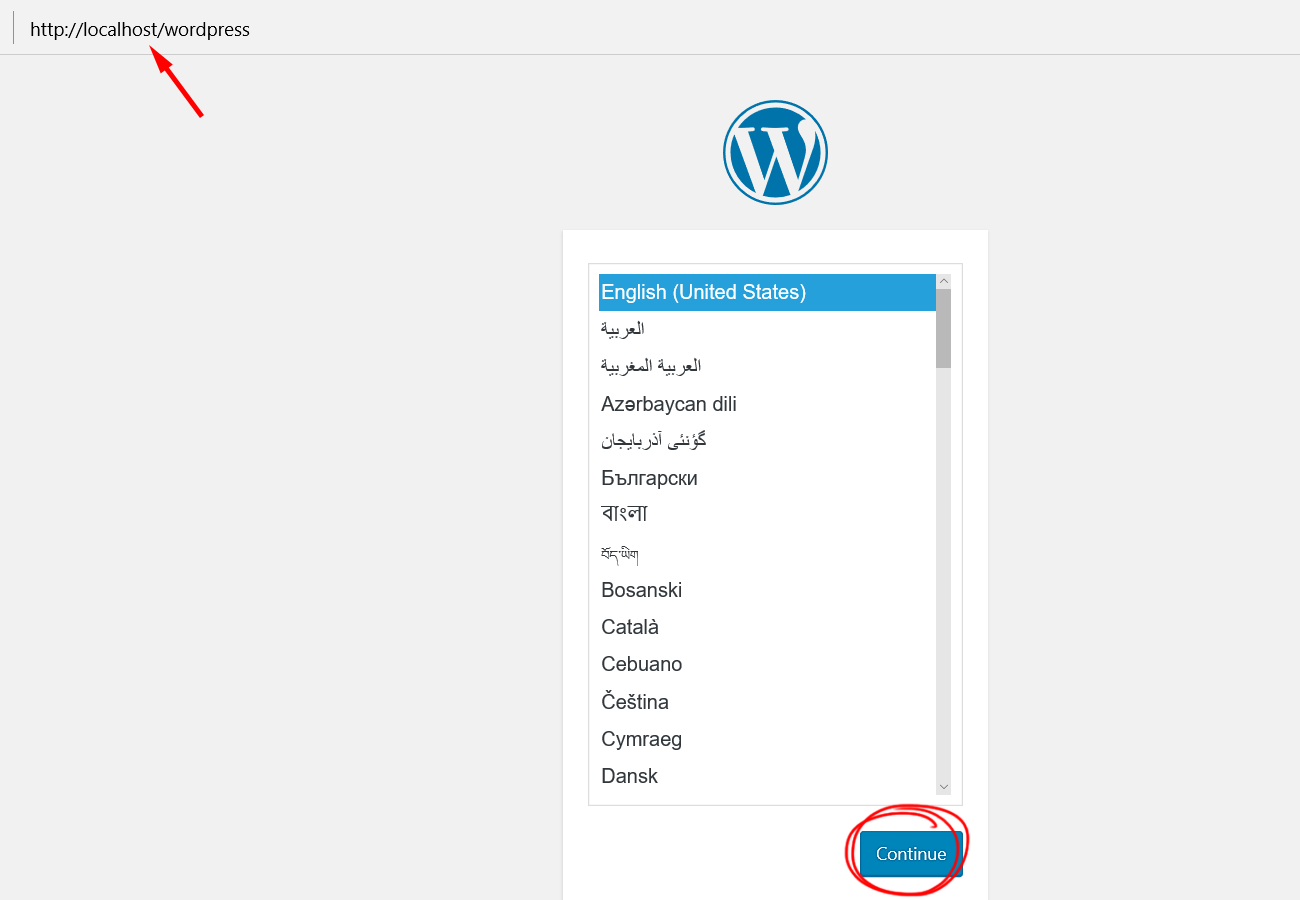 4)웹브라우저에서 http://localhost/wordpress를 입력하면 워드프레스 설치를 시작합니다.