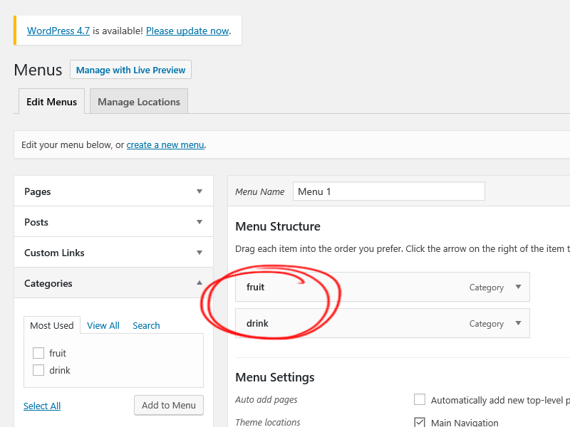 7)카테고리를 선택하고 add to menu를 클릭하면 우측 메뉴 구조에 해당 카테고리를 추가합니다.