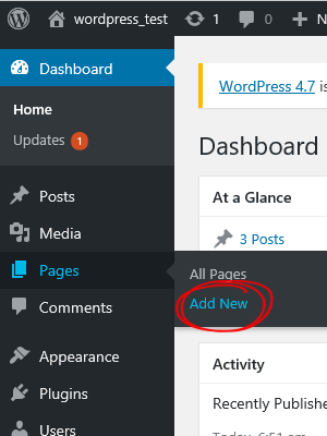 1)대시보드에서 좌측 pages 메뉴의 add new를 선택합니다.