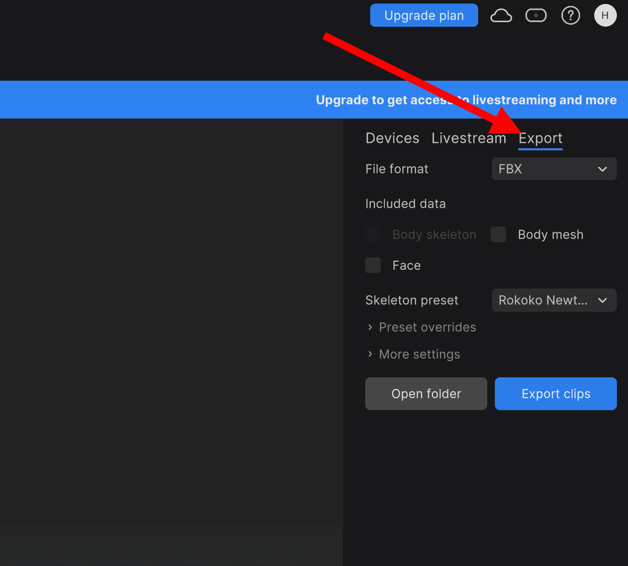 13)애니메이션을 fbx파일로 내보내기하려면 우측상단의 export를 선택합니다.
