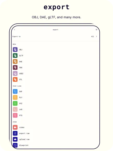 메시 데이터(obj, dae, fbx, stl), 색상 포인트 클라우드 데이터(dxf, ply, las, xyz, pts), 기타(png, dae)