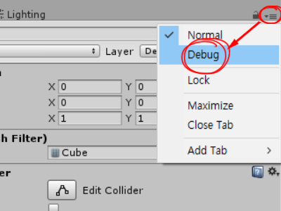 3)인스펙터의 우측 상단에서 Debug를 선택합니다.