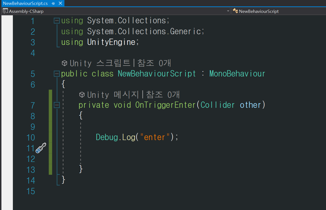 3)OnTriggerEnter함수를 작성하고 클래스를 추가합니다.