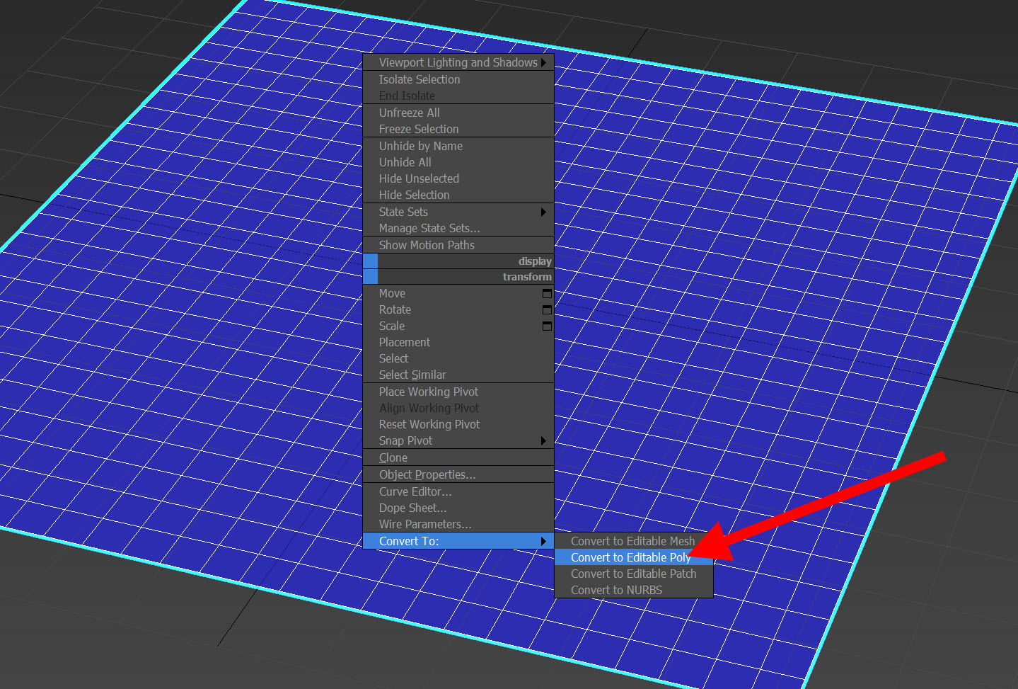 2)plane 오브젝트를 editable poly로 변환합니다.