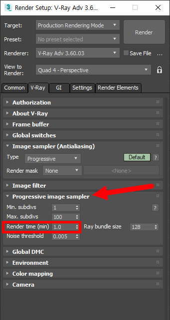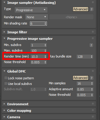 3)progressive image sampler에서 render time이 기본값 1로 설정되어있는것을 확인할수있습니다. render time은 최대 렌더시간(분)을 의미합니다.