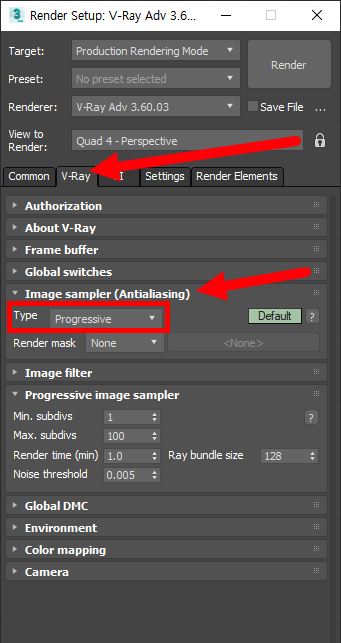 2)렌더 설정(render setup)으로 이동합니다. v-ray 탭의 image sampler에서 progressive 유형을 선택합니다.