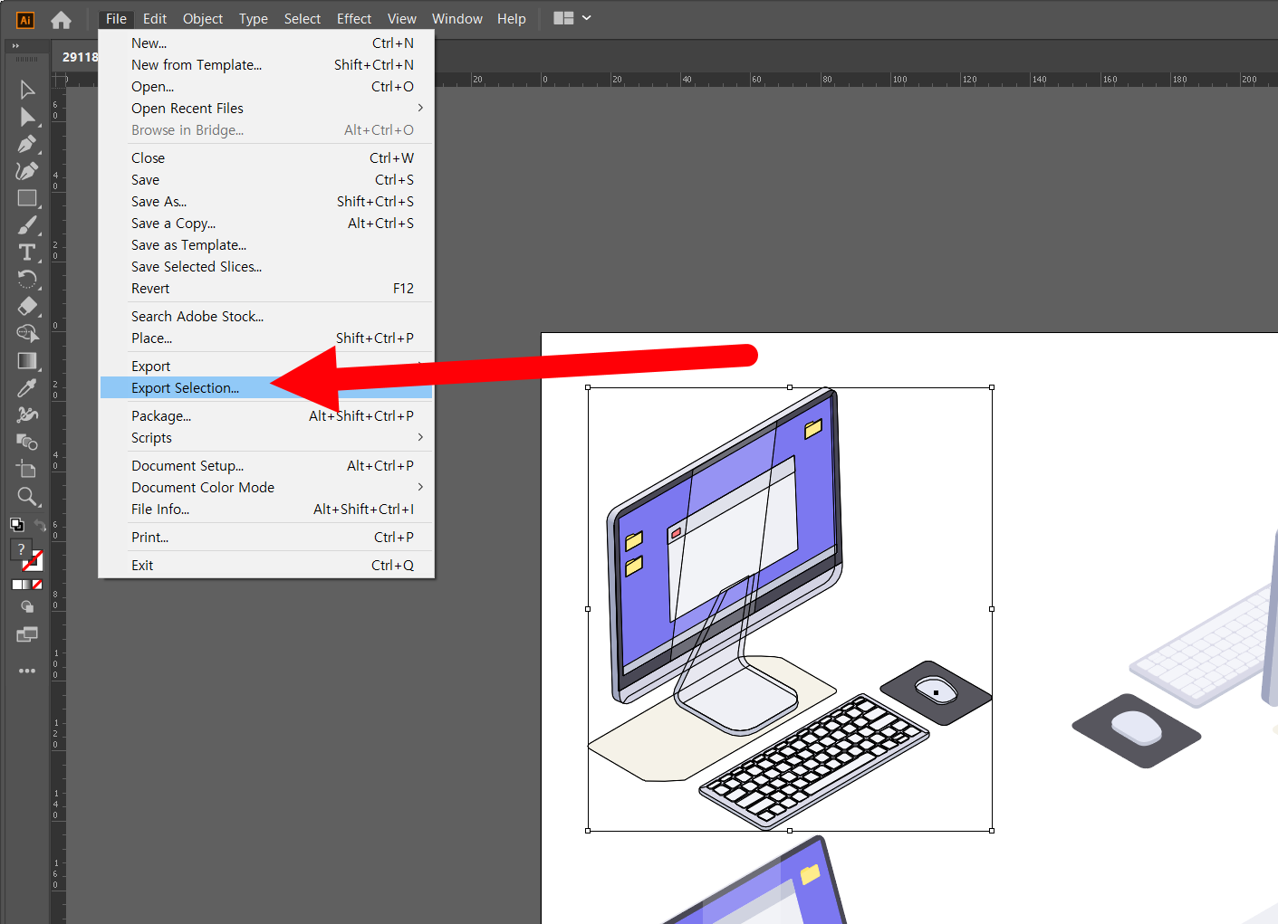 3)대상을 선택하고 상단의 file 메뉴에서 export selection을 선택합니다.