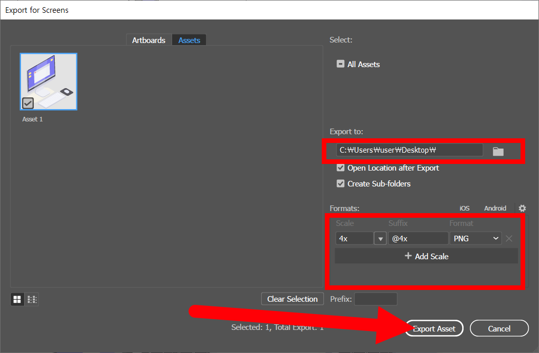 4)내보내기 옵션에서 저장 위치와 이미지 크기 및 포맷(PNG)을 설정하고 export asset을 클릭합니다.