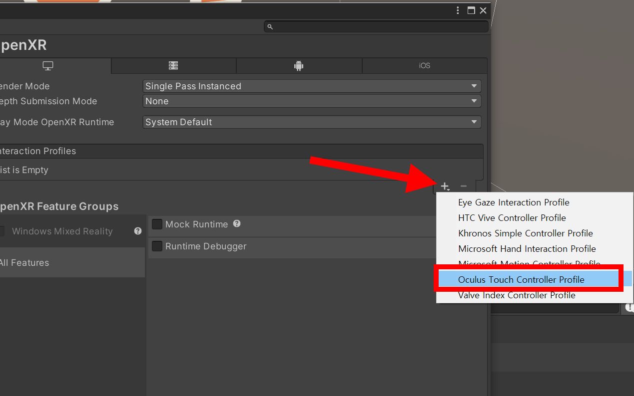 4)새로운 interaction profiles 추가에서 Oculus Touch Controller Profile을 선택합니다.