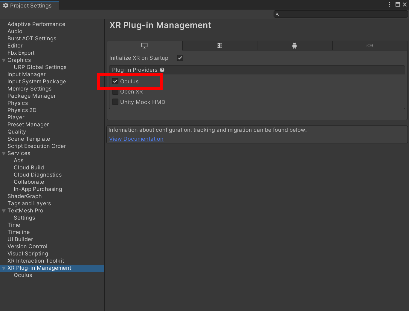 1)project settings의 XR Plug-in management에서 Oculus에 체크되어있는것을 확인할수있습니다.
