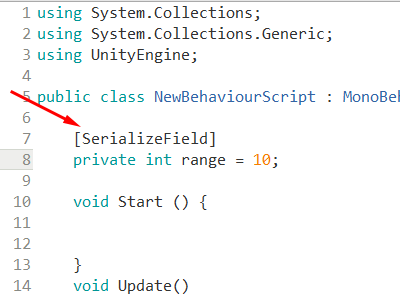 일반적으로 유니티가 스크립트 컴포넌트를 직렬화할때 public 필드만 직렬화합니다. private으로 선언한 변수는 인스펙터(inspector)에서 표시하지않습니다. private으로 선언한 변수 또는 비공개 필드를 직렬화하려면 SerializeField 속성을 추가합니다.