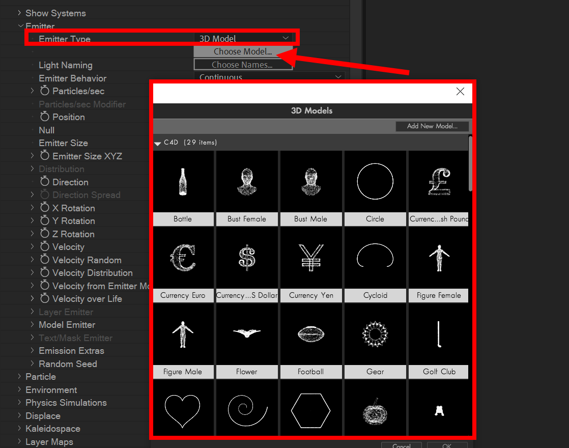 5)choose model을 클릭하면 particular에서 제공하는 기본 3D 모델들을 확인할수있습니다.