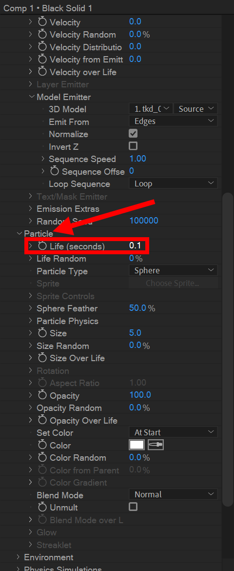 13)particle의 life(수명)에 값을 입력합니다(0.1)