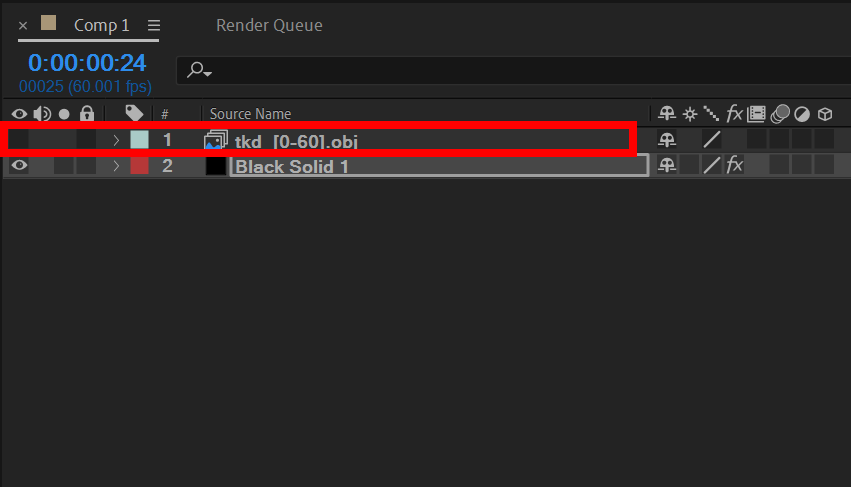 9)컴포지션에 해당 3D model의 obj 시퀀스가 레이어로 추가되고 숨기기되어있는것을 확인할수있습니다.