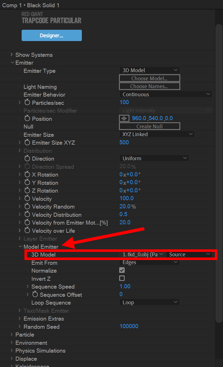 8)model emitter의 3D Model에 사용자 3D 모델이 소스로 설정되어있는것을 확인할수있습니다.