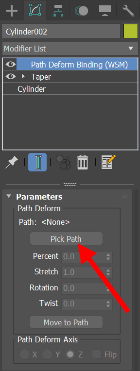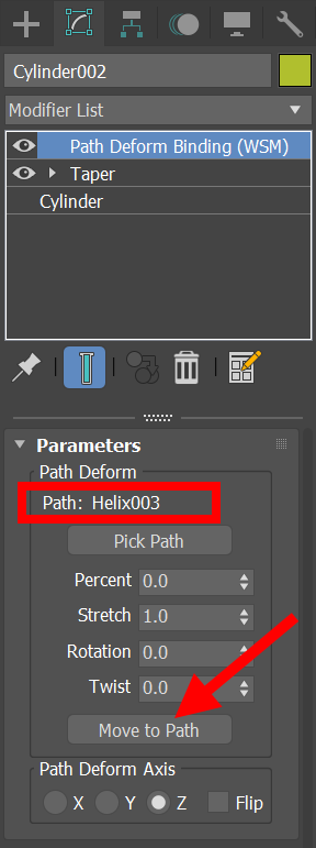 6)taper수정자 상위에 path deform binding(WSM) 수정자를 추가합니다. pick path를 클릭하고 helix 오브젝트를 선택합니다.