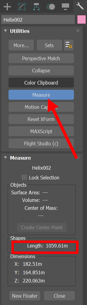 2)스플라인 오브젝트를 선택하고 utilities의 measure로 이동하여 length에서 스플라인의 길이를 확인합니다.