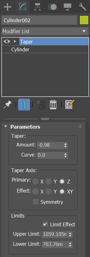 5)taper 수정자를 추가하고 amount, axis, limits를 설정합니다.