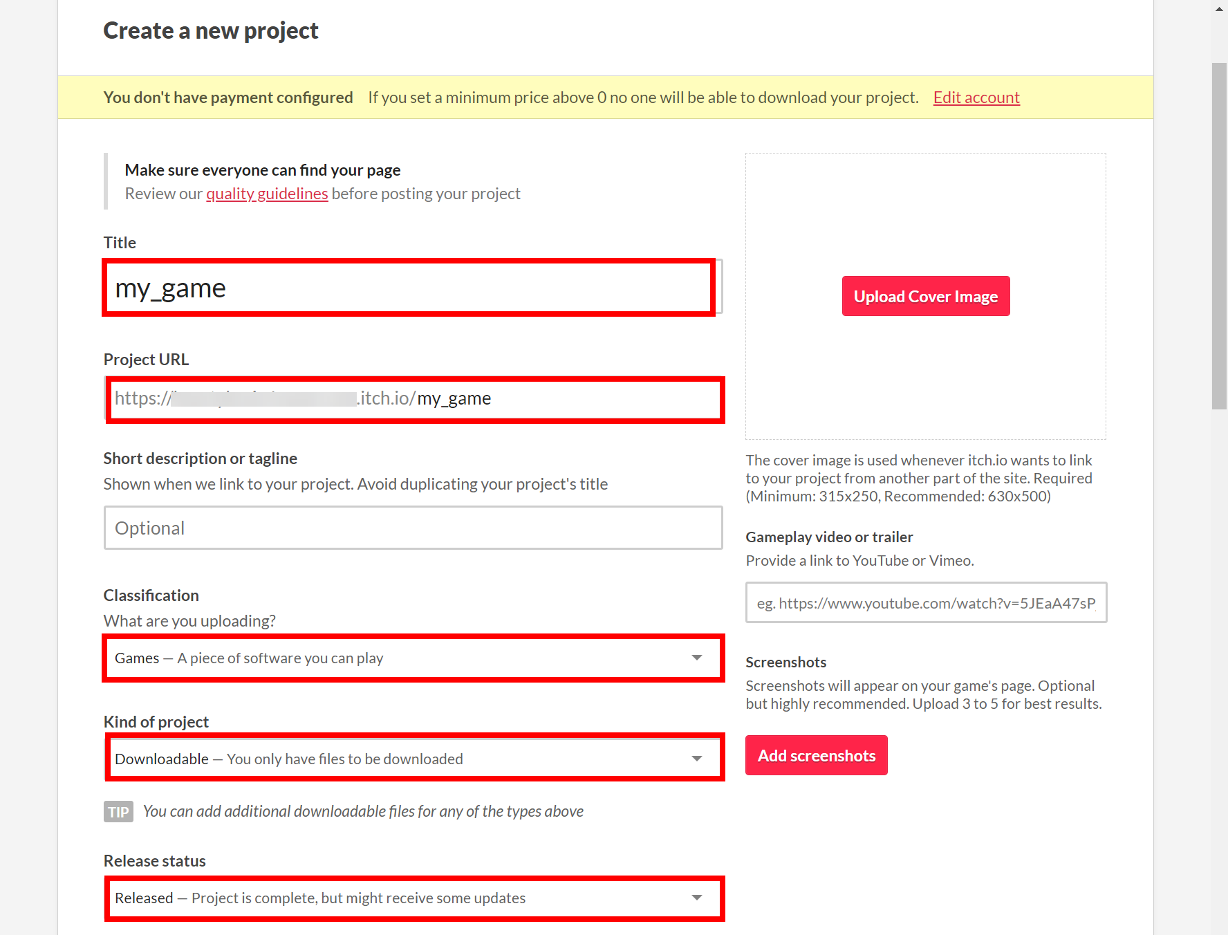 4)게임 제목(Title)과 프로젝트 URL(project URL)를 작성합니다. URL는 계정 이메일주소.itch.io/게임 제목으로 자동 설정됩니다. classification(games)와 kind of project(downloadable)를 선택합니다. 릴리즈 상태(release status)를 선택합니다. released는 업데이트 가능한 완성 프로젝트를 의미합니다.