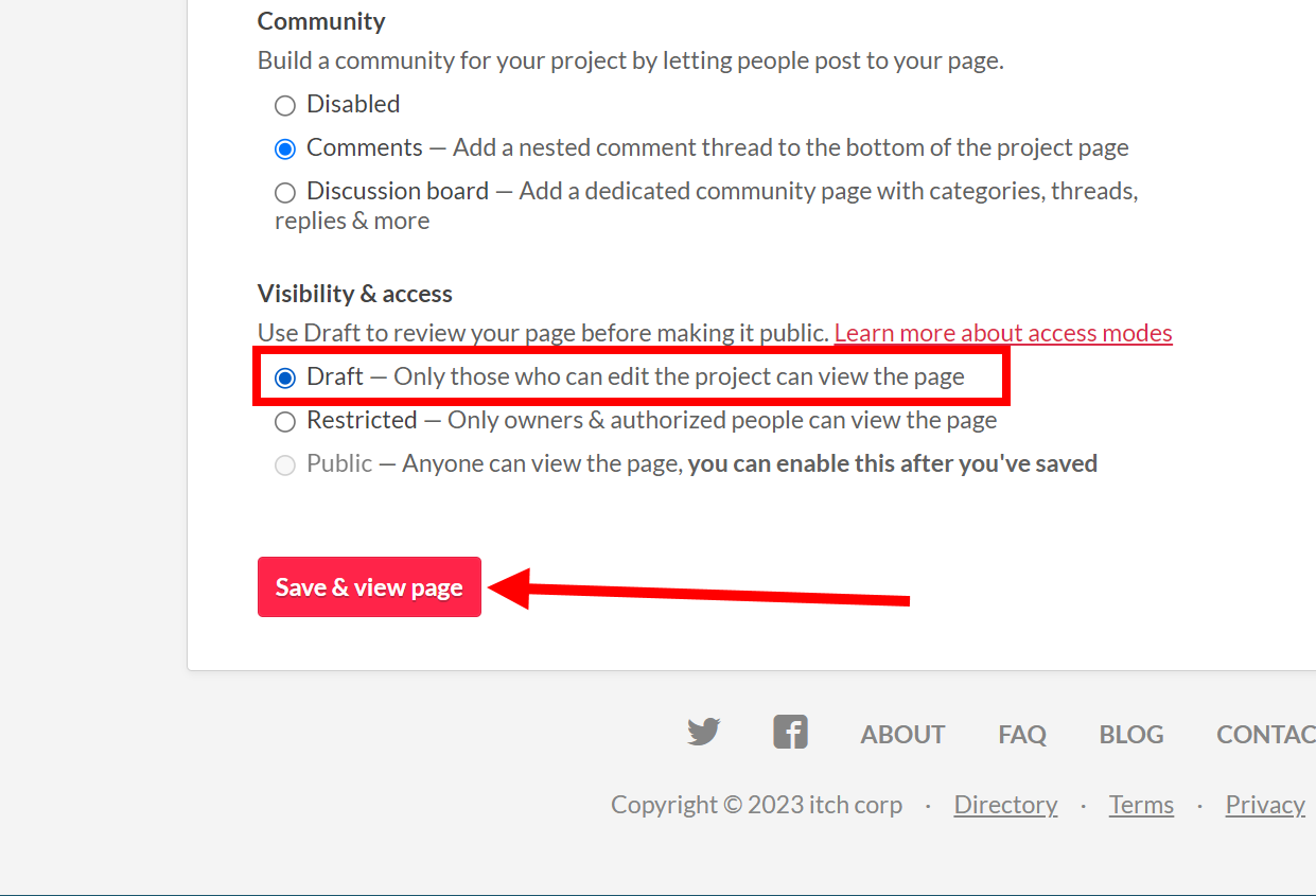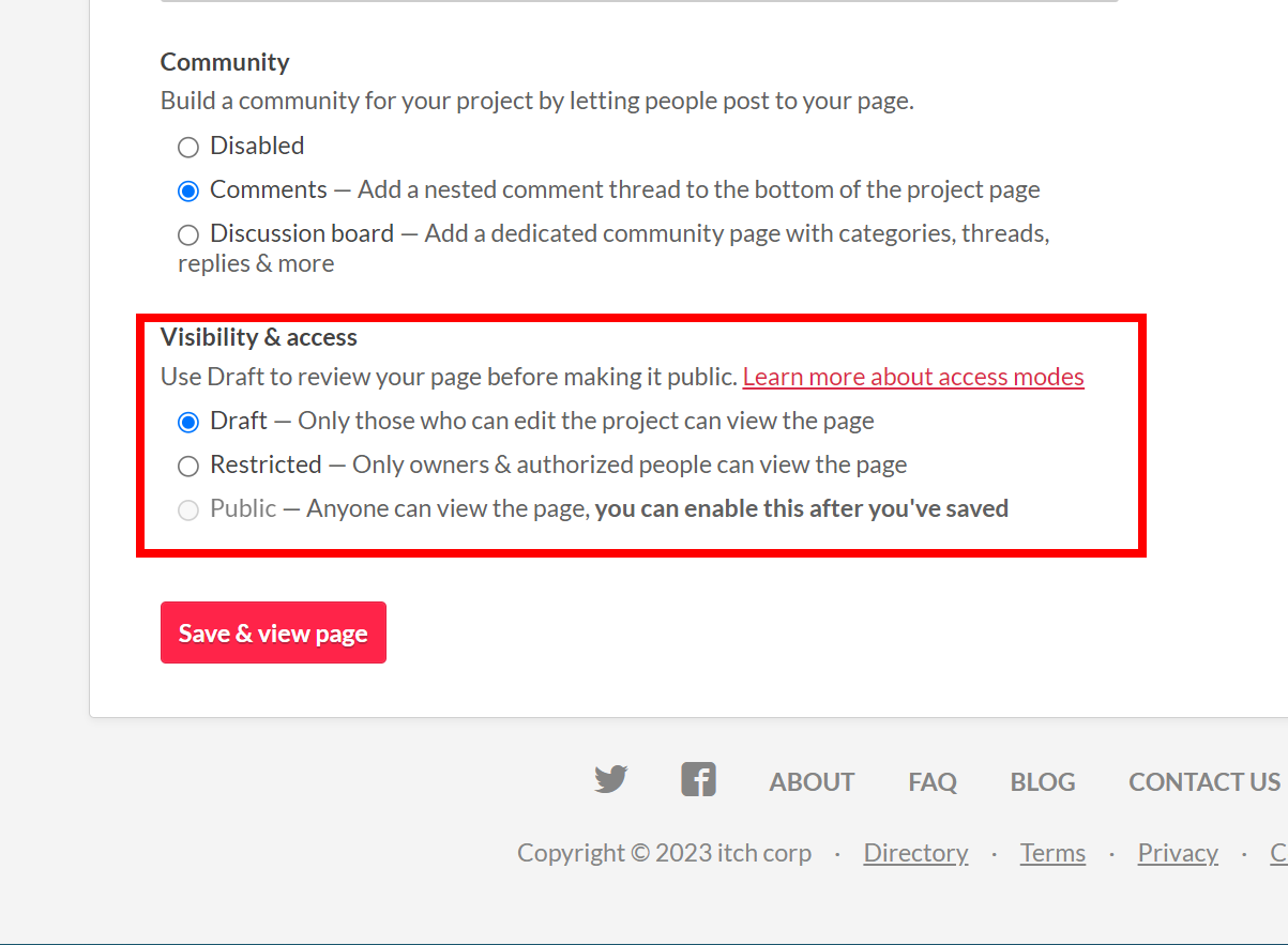 11)visibility & access에서 public 옵션이 활성화된것을 확인할수있습니다. save를 클릭하면 수정사항이 반영됩니다. view page를 클릭하면 프로젝트 URL로 이동합니다.
