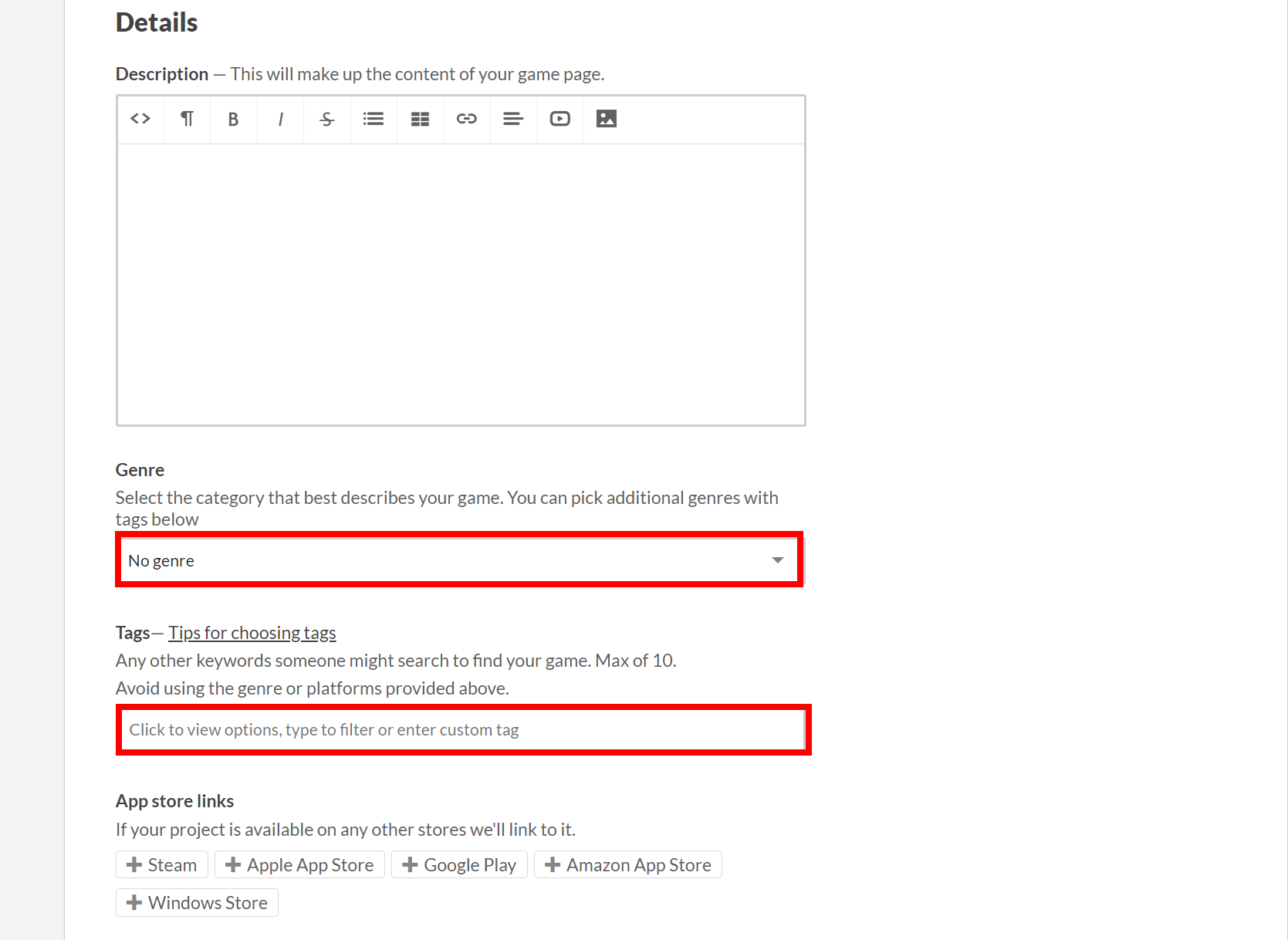 7)게임 설명(description)을 입력하고 장르(genre) 및 태그(tags)를 설정합니다.