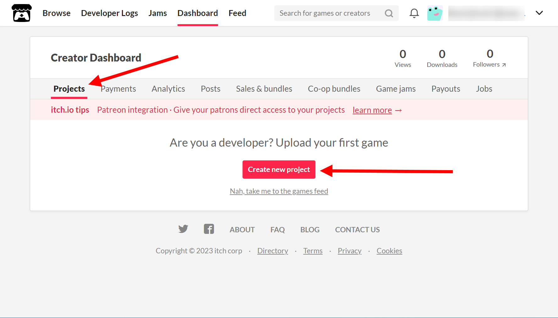 1)itch.io 웹사이트로 이동하고 계정 로그인합니다.