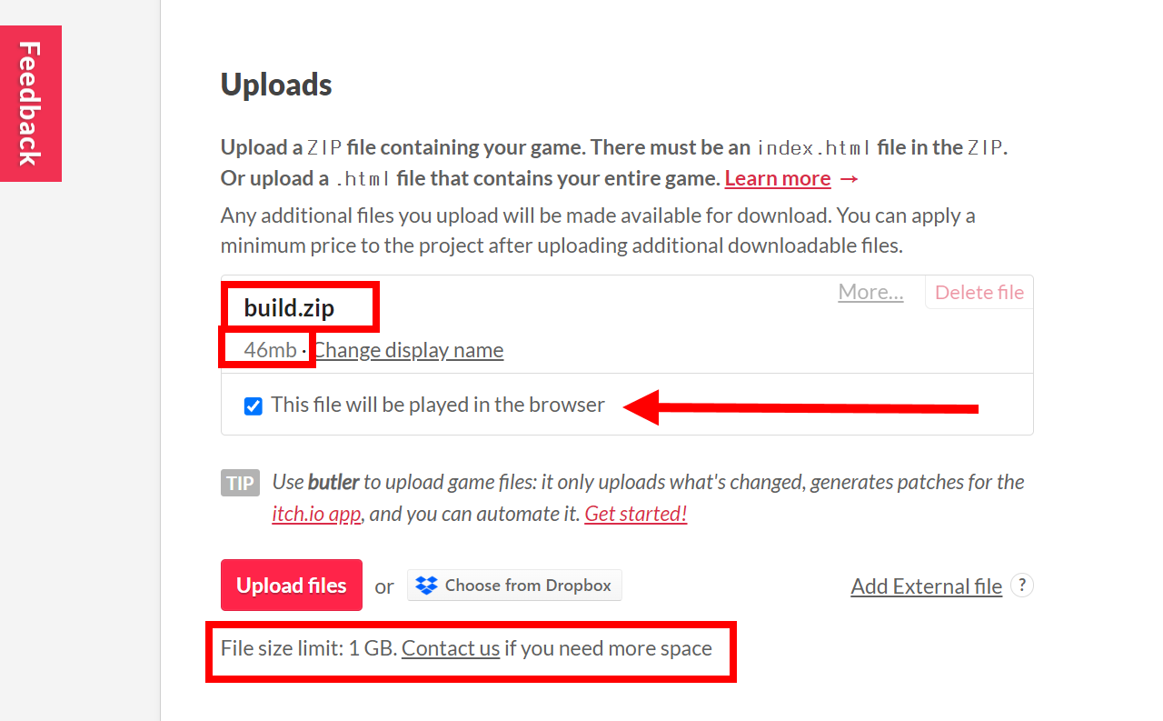 https://itch.io/docs/creators/html5#zip-file-requirements