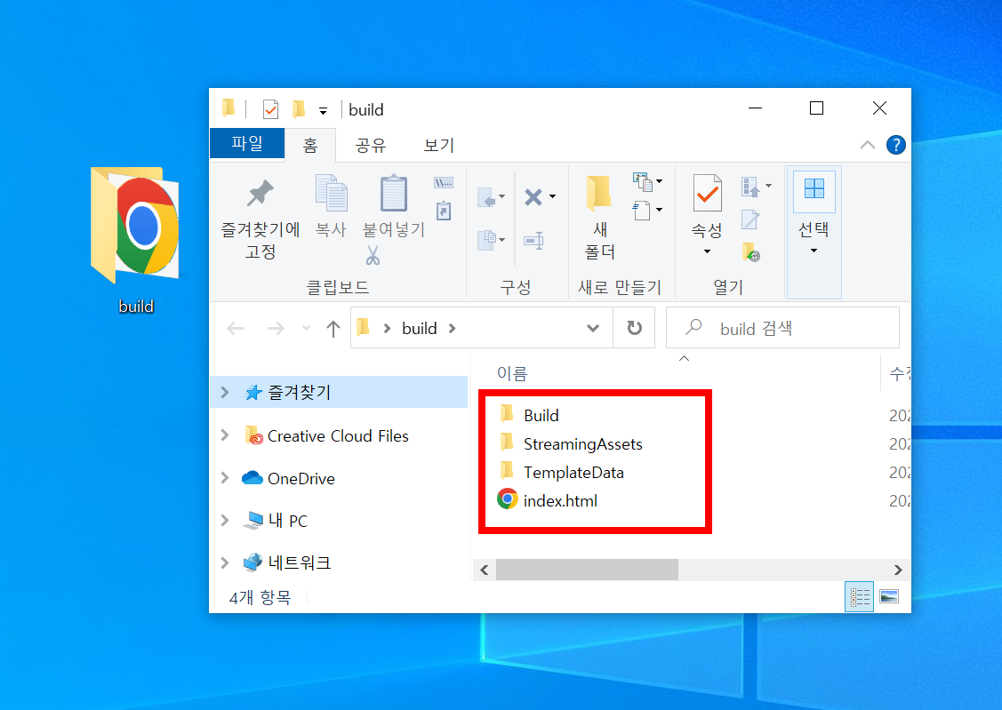 1)유니티에서 빌드한 webGL 프로젝트를 준비합니다. 기본적으로 build, streamingAssets, TemplateData, index.html 폴더 및 파일로 구성되어있습니다.