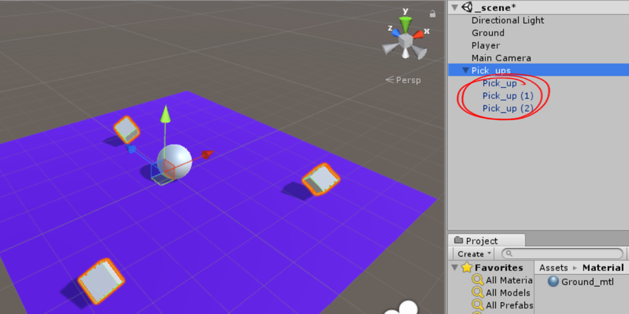 3)프리팹의 오브젝트(Pick_up)를 다중 복사하고 위치를 설정합니다. 새로운 게임 오브젝트(empty gameobject)를 생성하고 복사한 오브젝트들의 부모 오브젝트로 설정합니다.