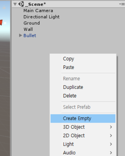 4)새로운 게임 오브젝트를 생성합니다(create empty)
