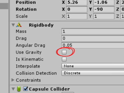 10)리지드바디의 중력을 비활성화하려면 use gravity를 체크해제합니다.
