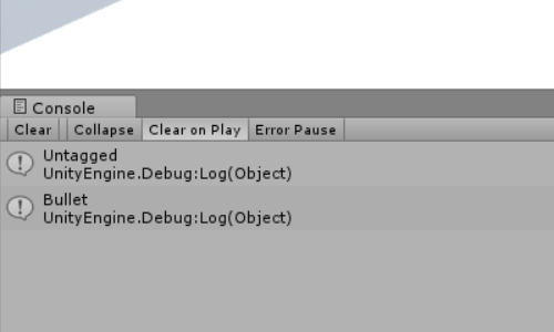 22)게임을 시작하면 총알이 앞방향으로 이동하고 콘솔 패널(Console)에 문자열 Untagged를 출력합니다.