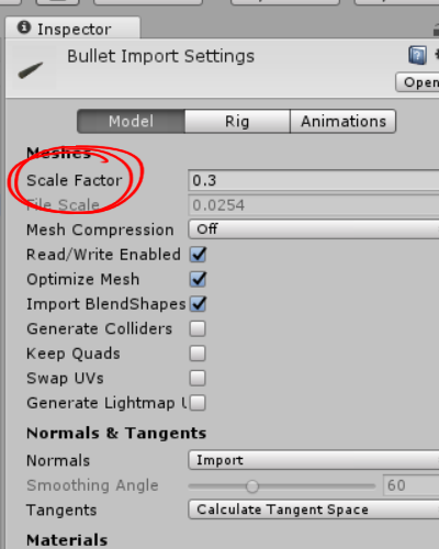8)가져오기한 3D 모델의 크기를 재설정하려면 import settings의 scale factor 수치를 입력하고 적용합니다.