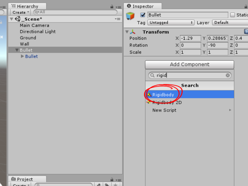 9)GameObject의 이름을 설정하고(Bullet) 오브젝트에 리지드바디(rigidbody) 컴포넌트를 추가합니다.