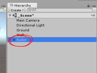 2)총알로 사용할 3D 모델을 프로젝트에 가져오기(import)하고 씬에 오브젝트를 추가합니다(Bullet)