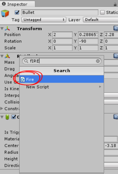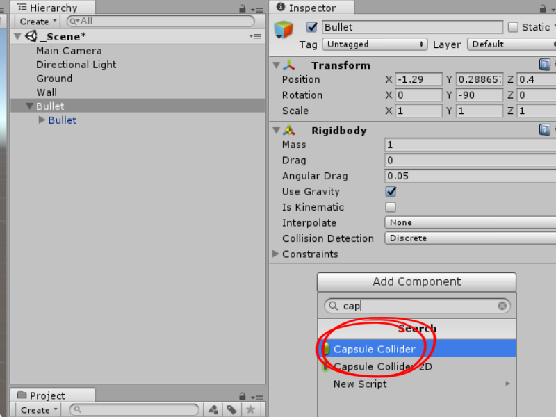 12)상위 Bullet 게임 오브젝트에 캡슐 콜라이더(Capsule Collider) 컴포넌트를 추가합니다.