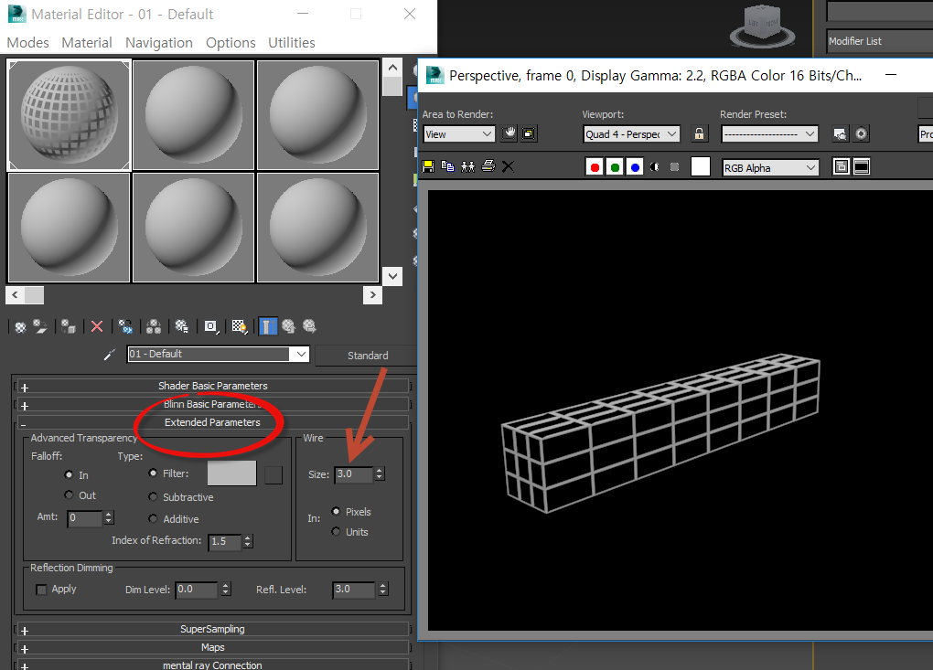 4)와이어프레임의 두께를 설정하려면 extended parameters에서 wire의 size 수치를 입력합니다.