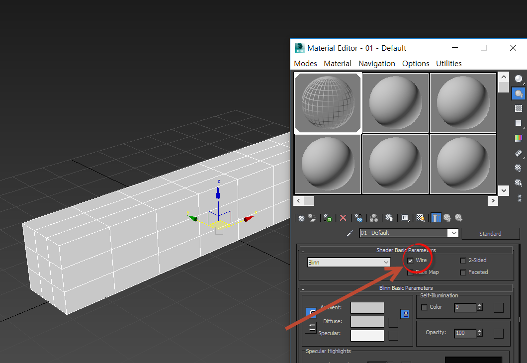2)standard 재질을 할당하고 shader basic parameters의 wire에 체크합니다.
