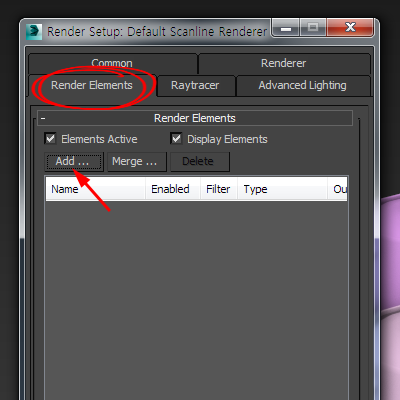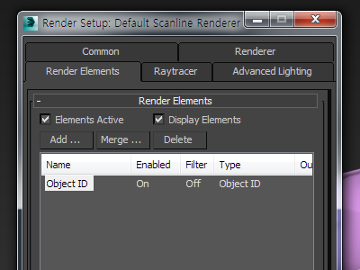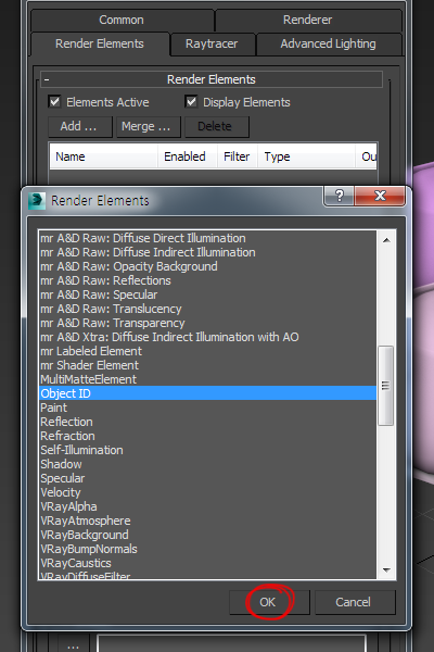 7)render elements탭에서 add를 클릭하고 ObjectID 요소를 추가합니다.