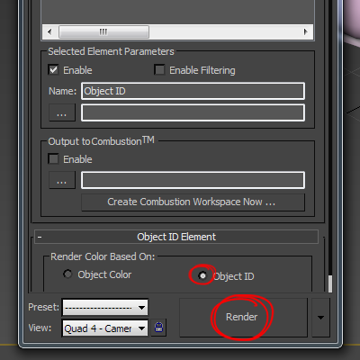 8)하단의 Object ID element에서 render color base on의 ObjectID에 체크하고 렌더링을 클릭합니다.