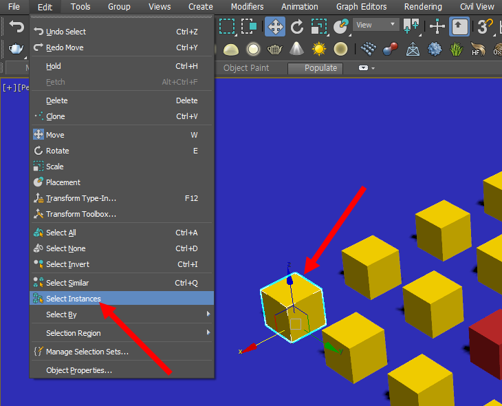 3)씬에서 해당 인스턴스 오브젝트를 모두 선택하려면 하나의 오브젝트를 선택하고 상단의 edit 메뉴에서 select instances를 선택합니다.